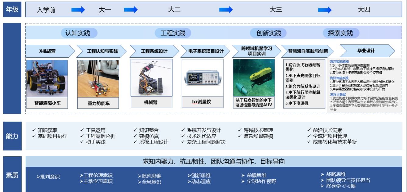 永利集团3044欢迎光临以智慧海洋科技项目为实践载体,构建 “兴趣激发—基础夯实—学科交叉 —前沿突破” 四阶递进培养架构,打造 “全贯通、立体化” 项目制课程体系。体系下设认知实践、工程实践、创新实践、探索实践4个模块,覆盖大一至大四全学段,形成 “能力—素质双维耦合” 的新工科人才培养范式,实现从知识建构到科研攻关的全链条培养闭环。