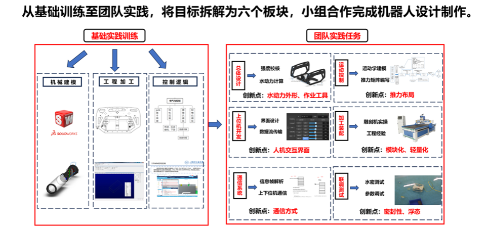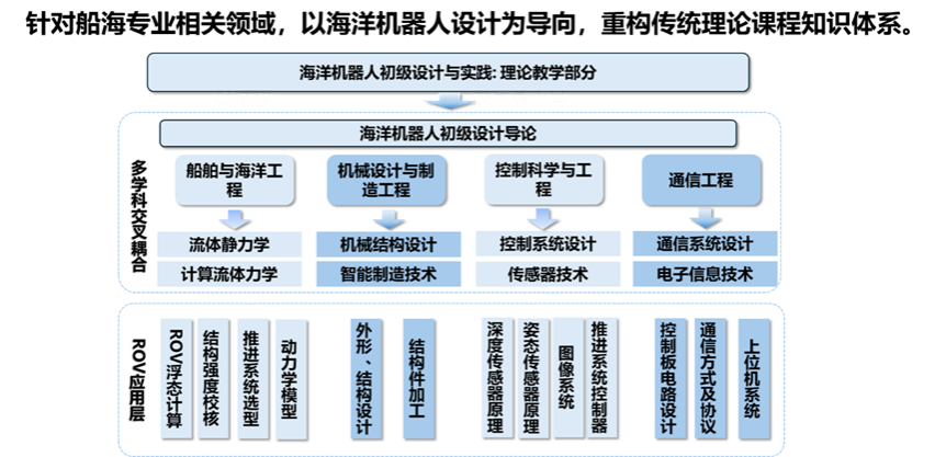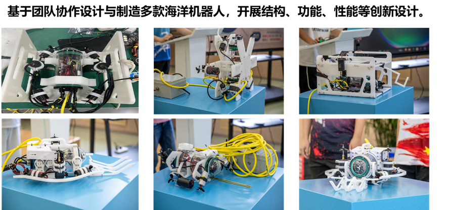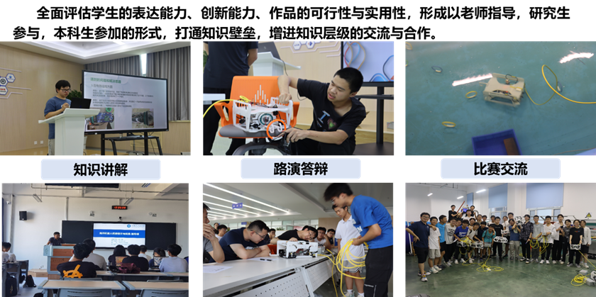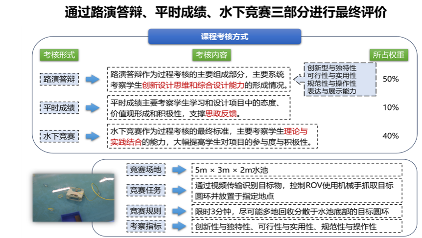 本课程分为先导课程、基础实践训练、实践制作以及课程竞赛四个部分,主要针对船舶与海洋工程专业相关领域,以海洋机器人设计为导向,重构传统理论课程知识体系。学生在老师的带领下从基础实践训练过渡到团队实践任务,开展引导式创新实践,将设计目标拆解为六个板块,通过小组合作形式完成机器人设计制作。运用趣味评价机制助推创新实践发展,全面评估学生的表达能力、创新能力、作品的可行性与实用性,形成以老师指导,研究生参与,本科生参加的形式,打通知识壁垒,增进知识层级的交流与合作。采用以赛代考的考核机制,通过路演答辩、平时成绩、水下竞赛三部分进行最终评价。通过创新实验室沉浸师生互动式的海洋机器人研发训练,培养了学生应用海洋工程、机械、电子控制、材料等知识解决海洋智能工程问题的综合实践和创新能力。